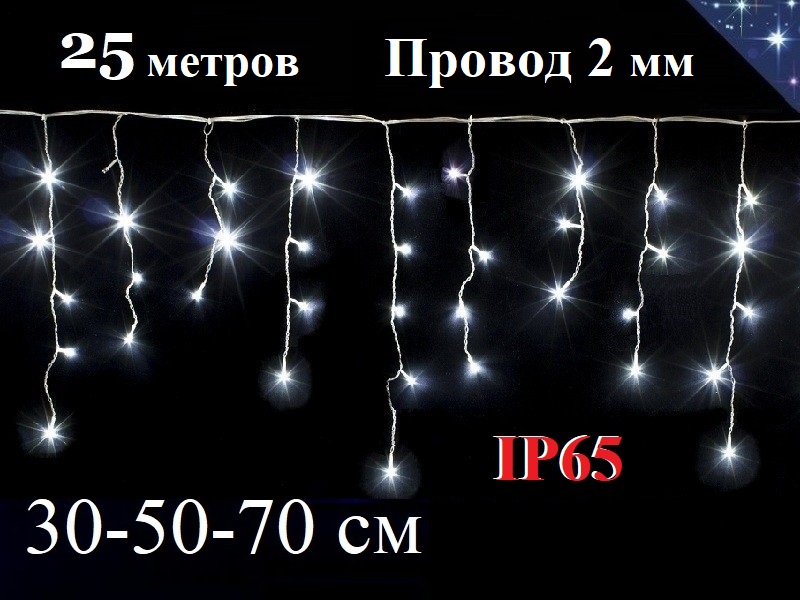 Светодиодная уличная гирлянда Белая с одиночным мерцанием Бахрома 25 метров имеет нити 30-50-70 см из белого провода 2 мм и предназначена для праздничного освещения на улице.