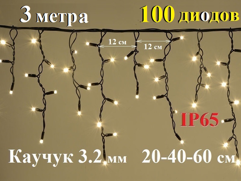 Теплая белая уличная гирлянда 3 метра Бахрома с белым мерцанием Черный каучук 3,2 мм диоды 8 мм 100 LED Winner Light IP65.