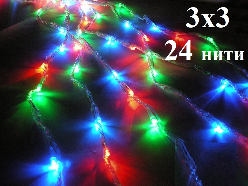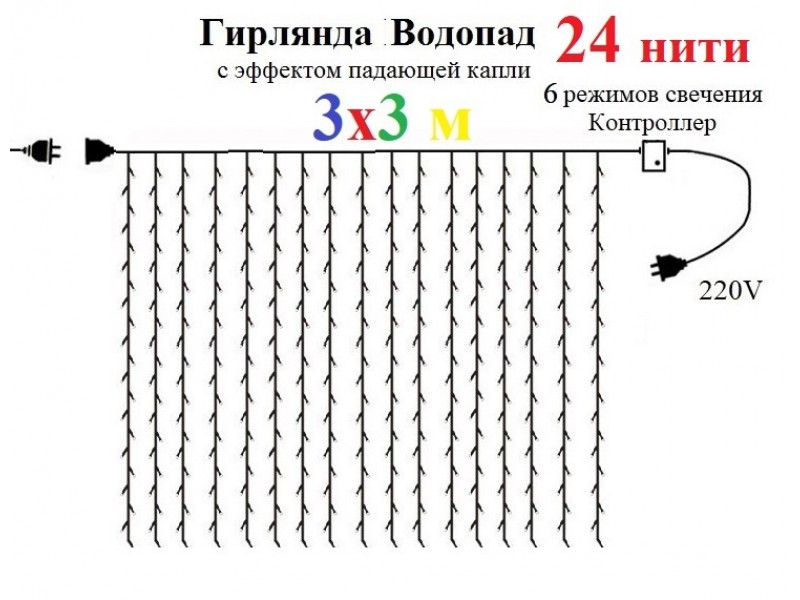 Цветная гирлянда Водопад 3х3 метра 24 нити это яркая световая штора с эффектом падающей капли украсит Ваш дом множеством многоцветных огней на Новый год.