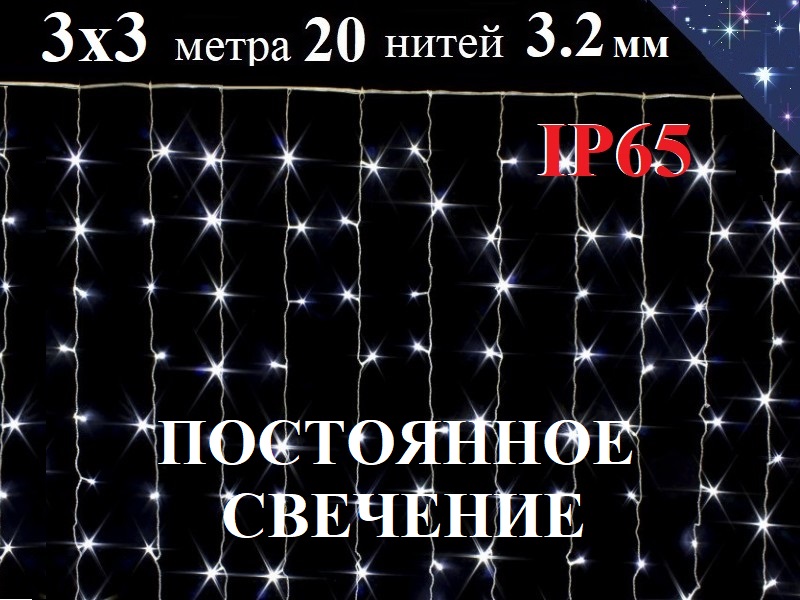 Уличная белая гирлянда штора-занавес 3х3 метра состоит из 20 морозостойких белых нитей 3.2 мм с белыми светодиодами 8 мм с постоянным белым свечением (без мигания и без мерцания) IP65.