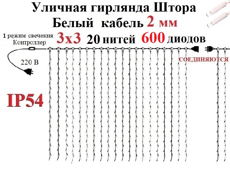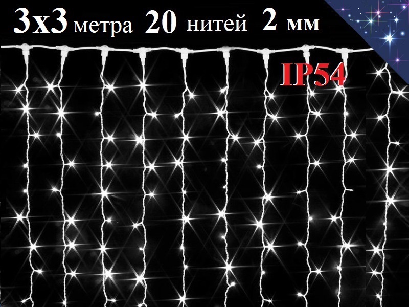Холодно белая уличная гирлянда штора 3х3 метра 20 белых нити 2мм 600 LED белых диодов 5 мм будет украшением на Новый год и создаст праздничное зимнее настроение. Winner Light IP54.
