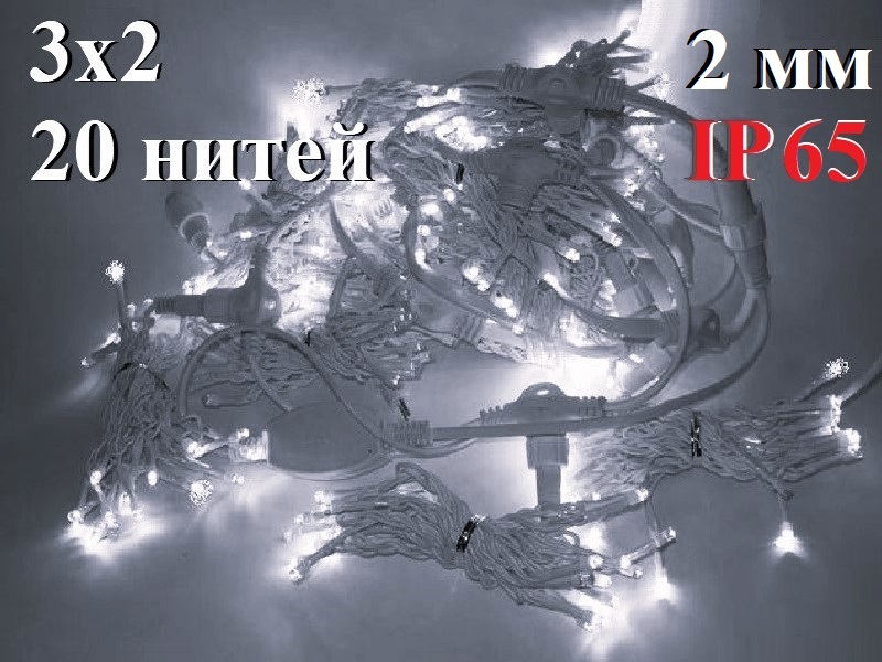 Уличная белая штора-занавес 3х3 метра состоит из 20 изящных белых нитей 2 мм с постоянным белым свечением и редким одиночным мерцанием каждого 20 огонька.