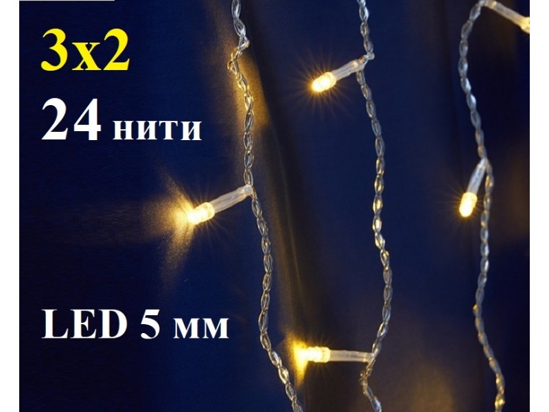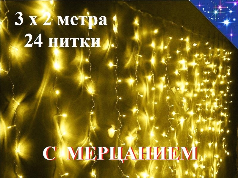 Светодиодная желтая штора 3х2 метра состоит из 24 прозрачных нитей с постоянным желтым свечением и редким одиночным мерцанием каждого 20 огонька будет украшением вашего семейного праздника.