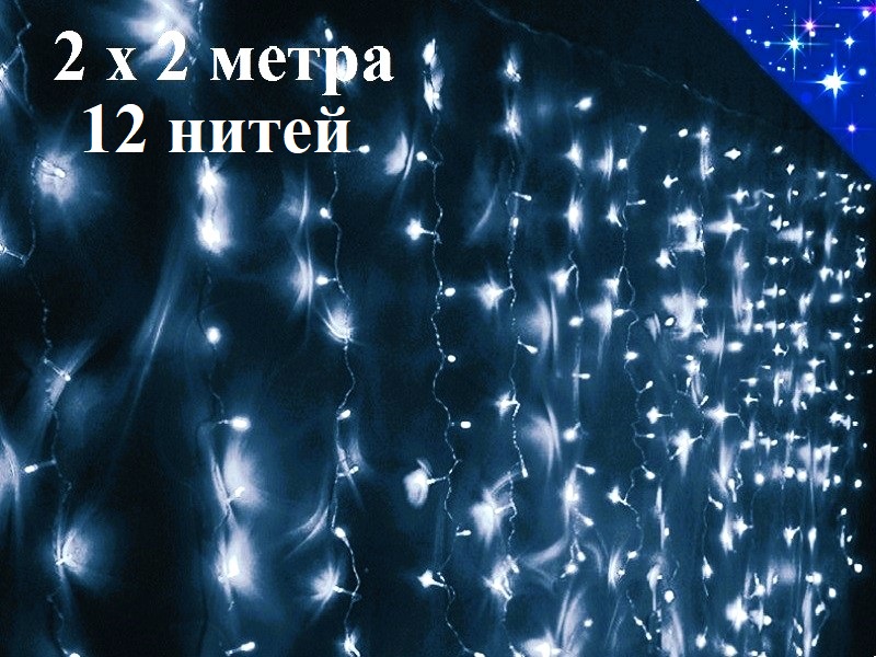 Гирлянда штора 2х2 метра Холодно белая с контроллером 12 нитей Прозрачный провод THY.