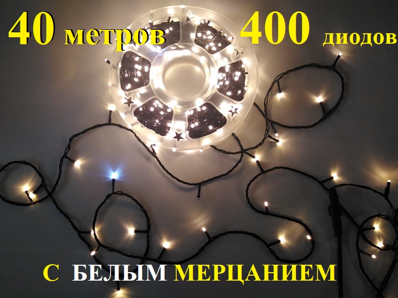 Теплая белая светодиодная гирлянда нить 40 метров для украшения елки или дерева на улице.