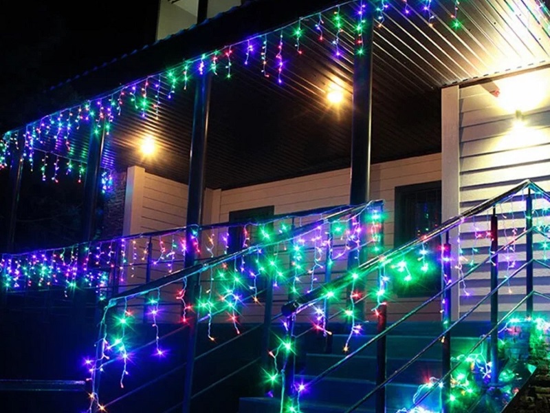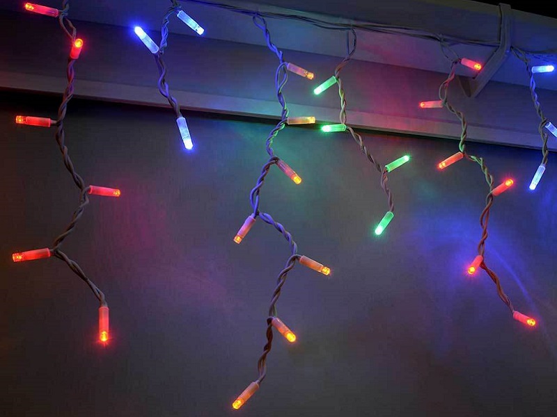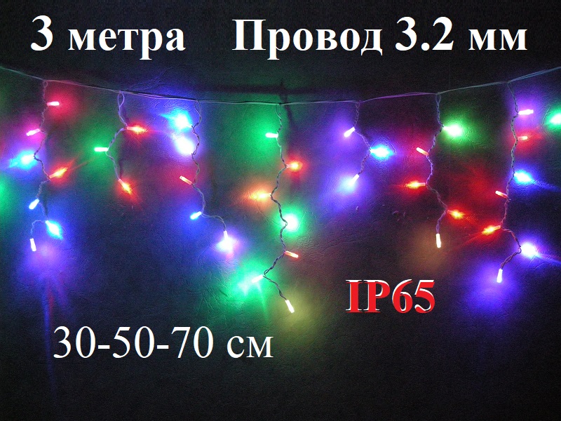Уличная гирлянда бахрома Цветная 3 метра имеет морозостойкий белый провод 3,2 мм и белые светодиоды 8 мм предназначена для праздничного освещения дома, бани или гаража IP65.