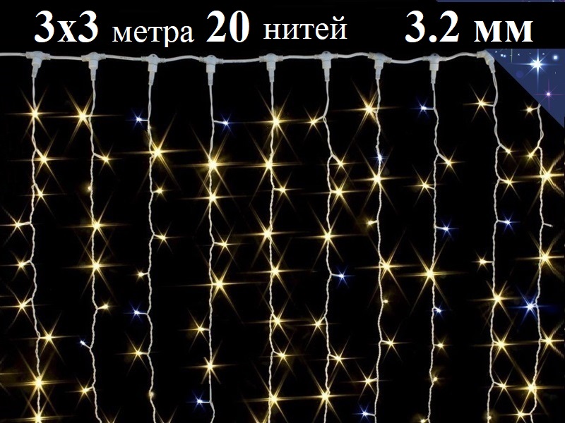 Светодиодная штора 3х3 состоит из 20 нитей с светло желтым постоянным свечением.