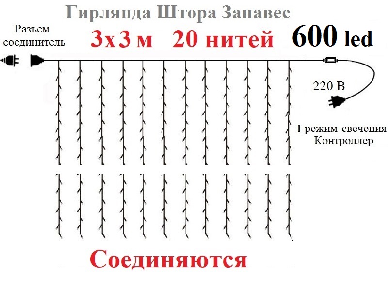 Гирлянды соединяются в 1 нить 3 метра + 3 метра + 3 метра+ ... до 6 штук