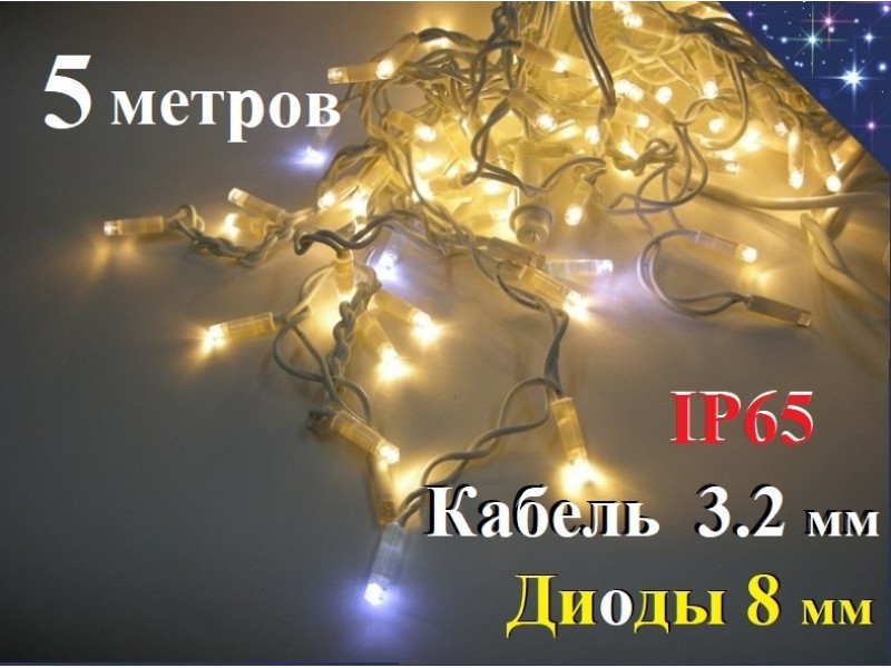 - Длина гирлянды - 5 метров + 1 метр провод с контроллером и вилкой для сети 220 Вольт.