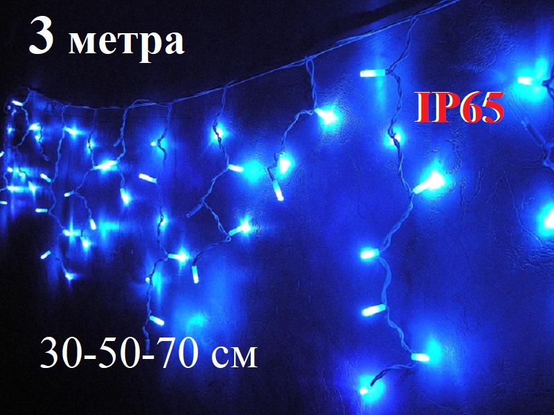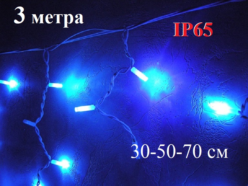 Уличная гирлянда Бахрома Синяя с белым мерцанием 3 метра 30-50-70 см имеет морозостойкий белый кабель ПВХ 3.2 мм и светодиоды 8 мм предназначена для праздничного освещения на улице.