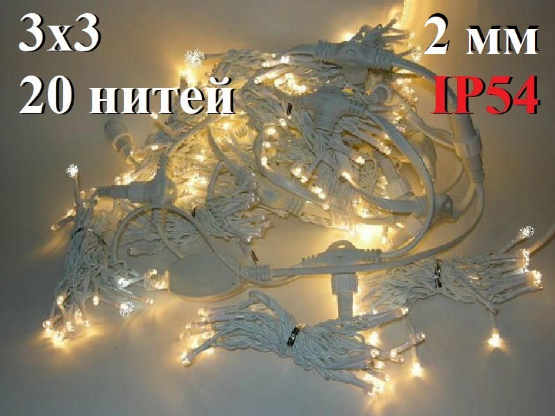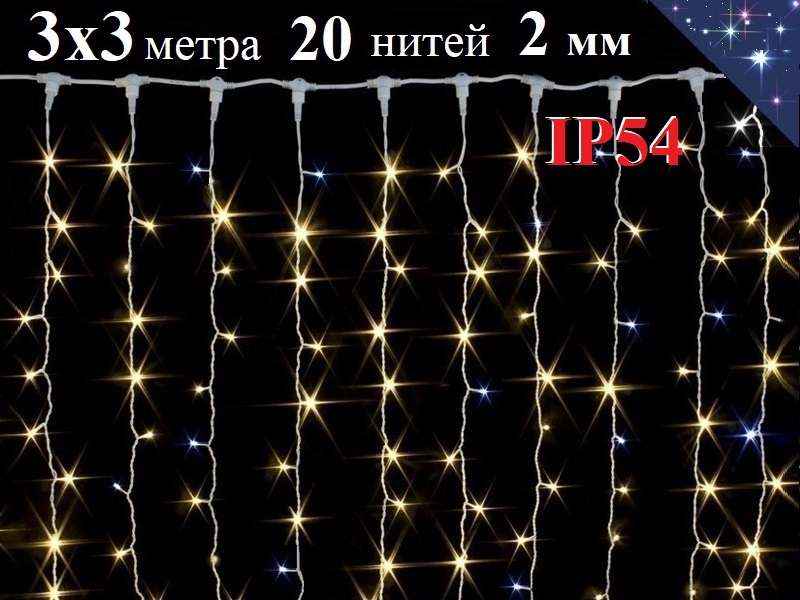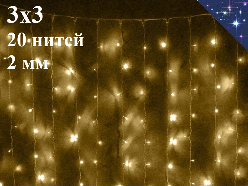 Уличная гирлянда штора занавес 3х3 метра Теплая белая состоит из 20 белых нитей 2 мм 600 диодов 5 мм с тепло белым постоянным свечением и одиночным белым мерцанием каждого 20 огонька.