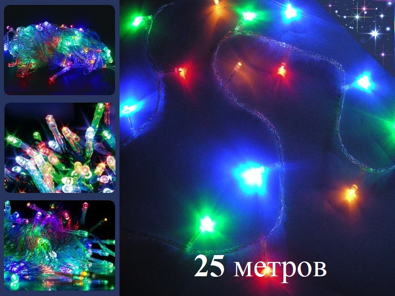 Цветная гирлянда елочная нить 25 метров с прозрачным проводом и яркими многоцветными огнями украсит вашу елку на Новый год и создаст праздничное настроение.