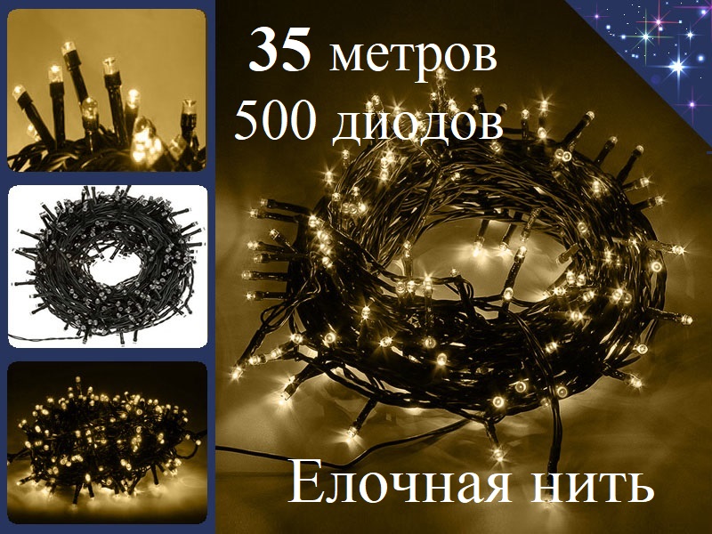 Желтая елочная гирлянда 25 метров черная нить с контроллером 500 LED украсит светодиодными огнями вашу елку на Новый год и создаст сказочное настроение.