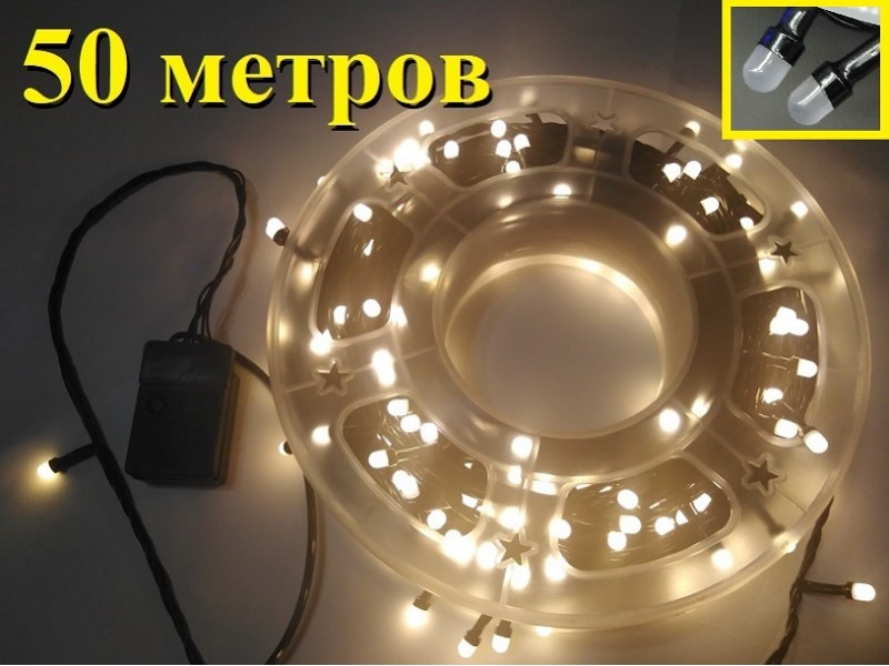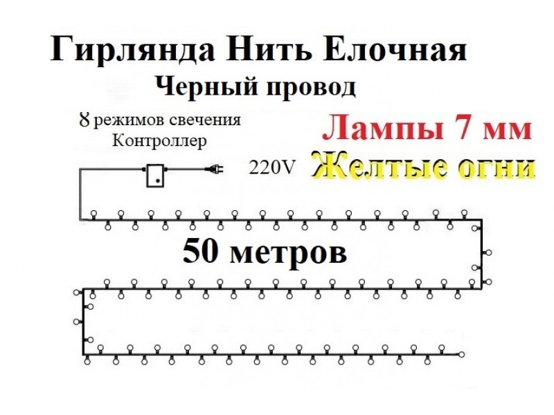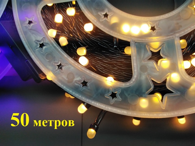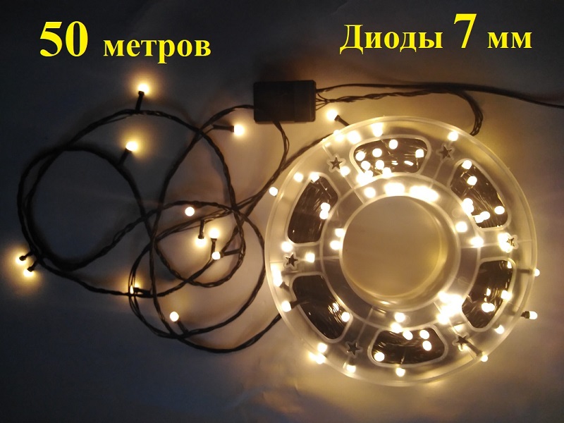 Желтая гирлянда нить на елку 50 метров крупные диоды 7 мм черный провод.