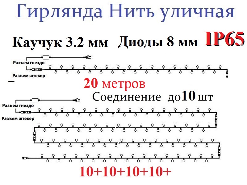 - Возможно соединение в единую цепь до 10 гирлянд.
