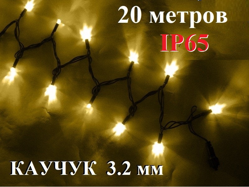 Желтая елочная гирлянда нить 10 метров из черного каучукового провода IP65 для уличного украшения ёлки или дерева.