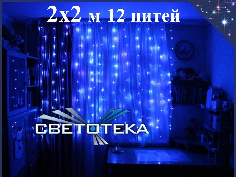 Гирлянда штора 2х2 метра синяя сверкает яркими синими огнями на 12 прозрачных нитях и создает праздничное настроение на Новый год.