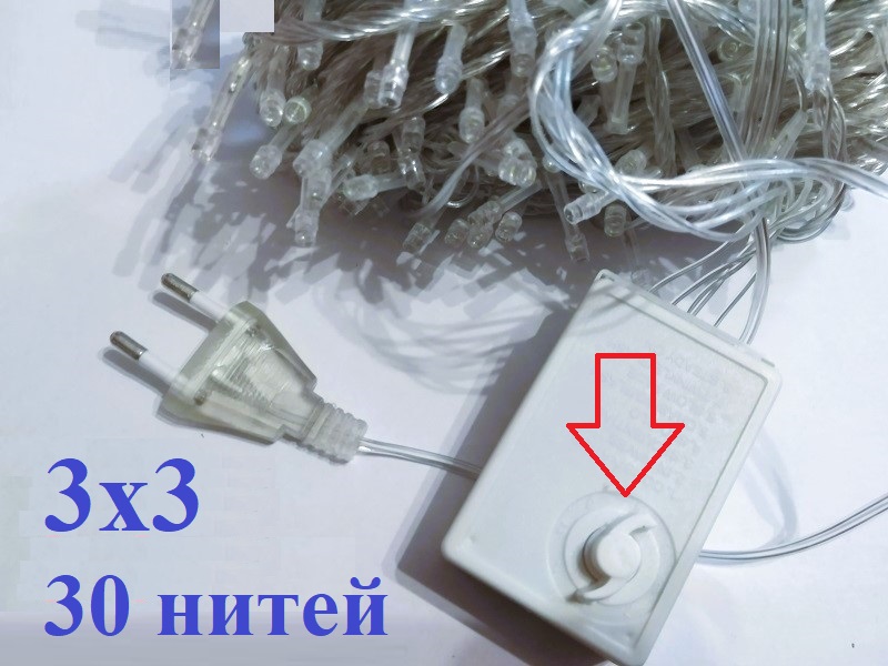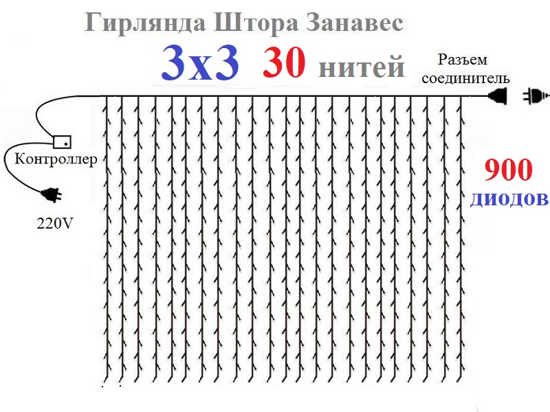 - Вид - занавес. Размер гирлянды 3х3 метра. Ширина: 300 см. Высота: 300 см.