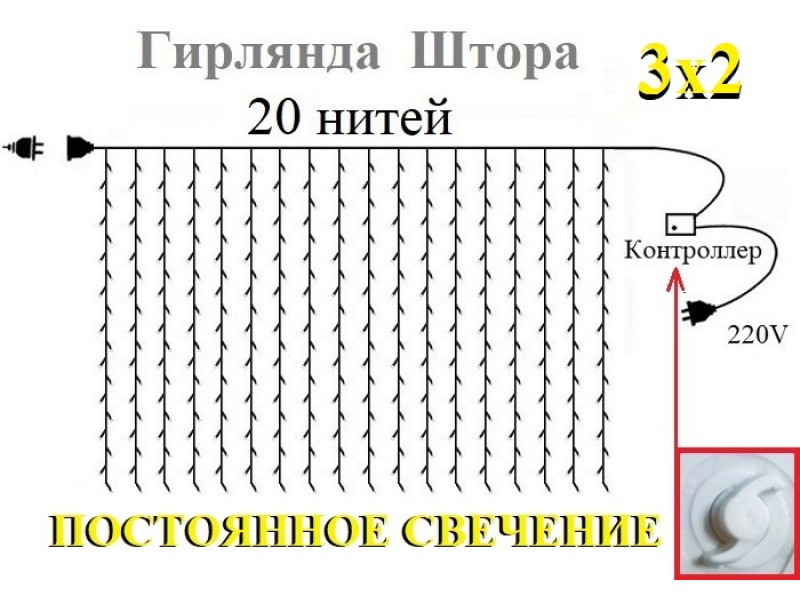 Гирлянда штора Белая 3х3 метра благодаря стрелочному контролеру имеет режим постоянного свечения и не будет раздражать своим миганием или мерцанием.