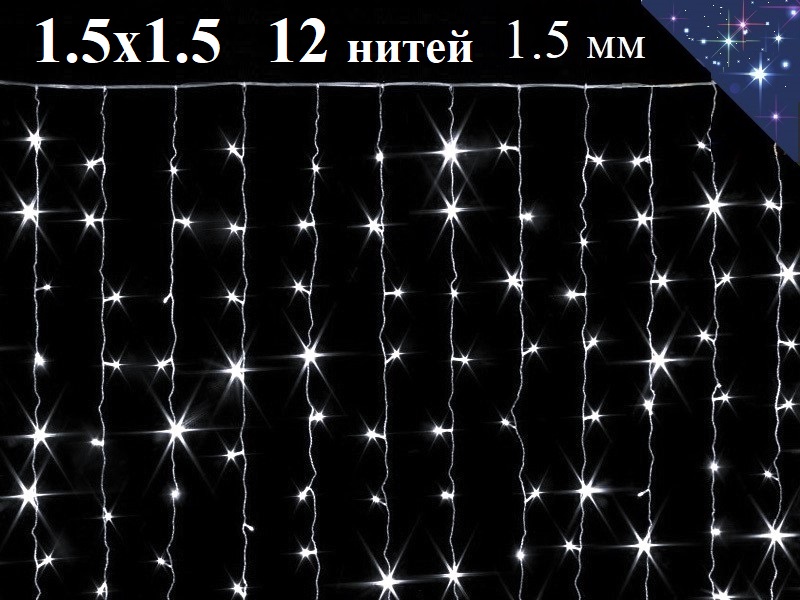 Гирлянда штора Холодная белая 1.5х1.5 метра с постоянным белым свечением 160 диодов на 12 нитях ярко украсит окно в Вашем доме и создаст праздничное настроение.