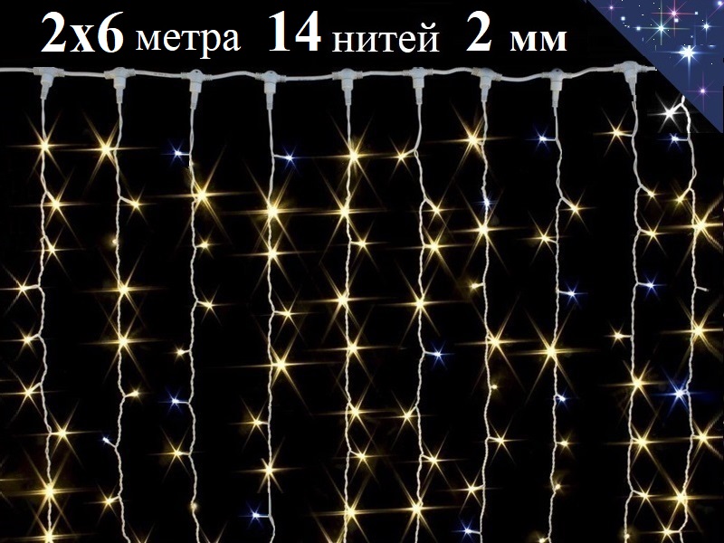 Уличная гирлянда штора занавес Теплая белая 2х6 метра с белым мерцанием 840 LED 14 нитей Белый провод 2 мм IP54 Winner Light.