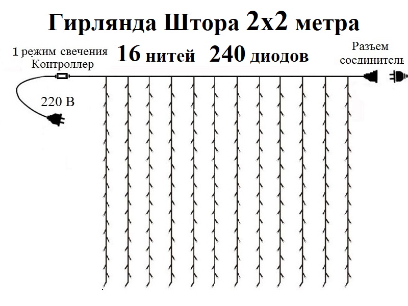 - Размер гирлянды 2х2 метра. Длина: 200 см. Высота: 200 см.