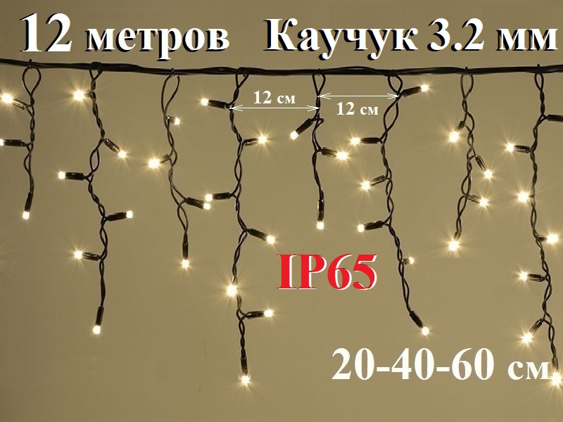 Уличная гирлянда теплая белая бахрома с белым мерцанием 12 метров имеет морозостойкий провод из черного каучука 3,2 мм и крупные белые светодиоды 8 мм предназначена для праздничного освещения дома, бани или гаража IP65.