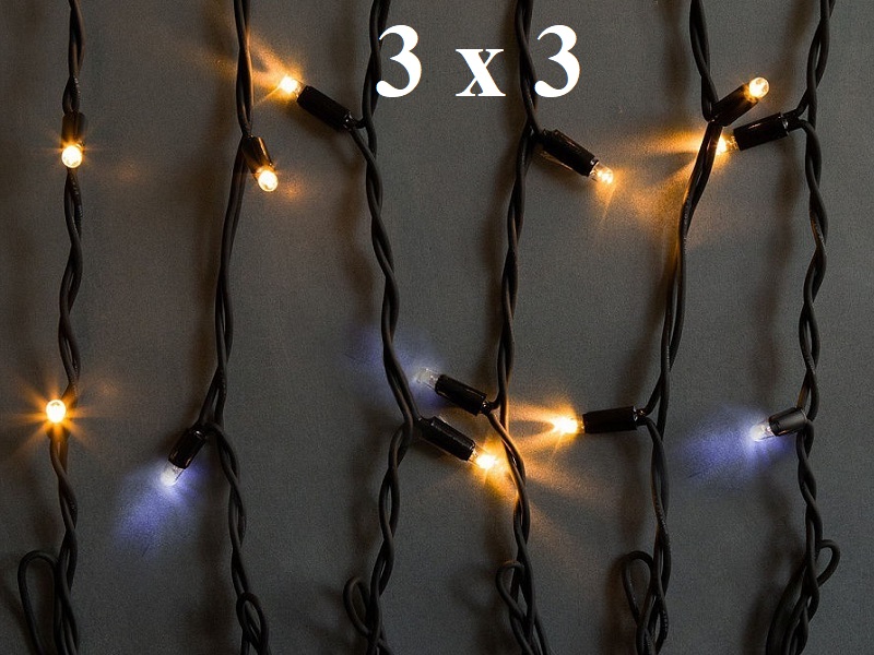 Уличная гирлянда Теплая белая штора 3х3 метра IP65 состоит из 20 черных нитей 3.2 мм 600 диодов 8 мм со светло желтым постоянным свечением и одиночным белым мерцанием каждого 10 огонька.
