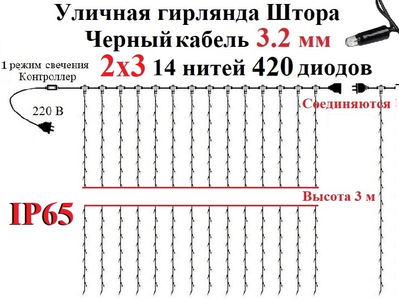 - Гирлянды соединяются и если сложить получится штора 3х2 метра 40 нитей.