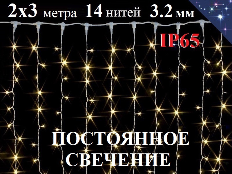 Гирлянда уличная штора 2х3 метра Теплая белая (желтая) с белым мерцанием 14 белых нитей каучук 3.2 мм диоды 8 мм 360 LED IP65.