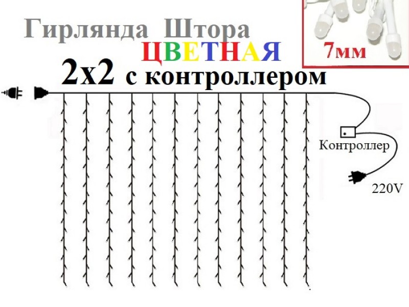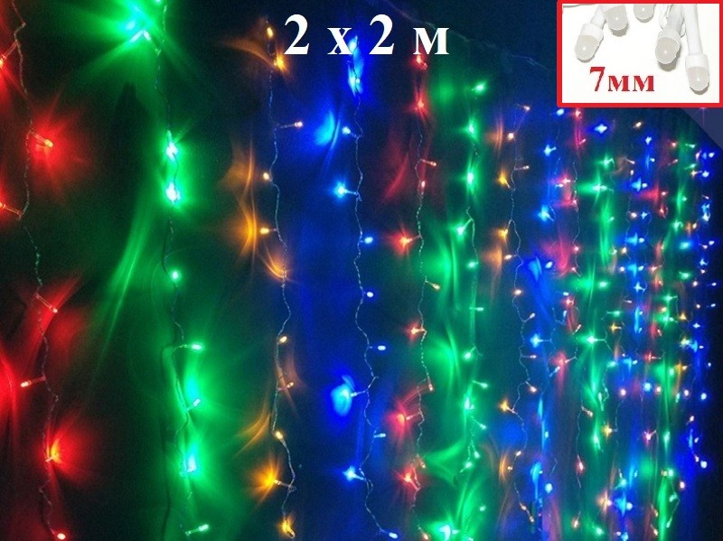 Светодиодная гирлянда на окно "Цветная штора 2х2 метра" с крупными светодиодами 7 мм..