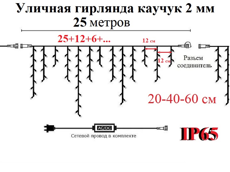 Длина гирлянды - 25 метров + 1 метр провод с контроллером и вилкой для сети 220 Вольт.