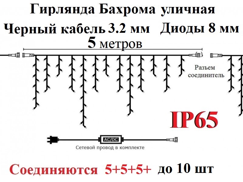 - Соединение в единую цепь 3+3+3+3+3+ до 10 гирлянд.