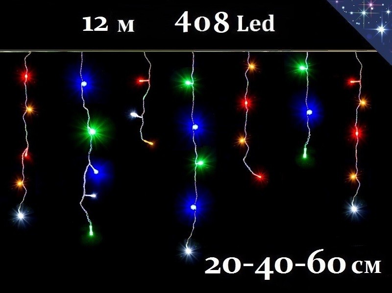 Уличная гирлянда Светодиодная цветная бахрома 12 метров 408 LED в виде сосулек празднично украсит фасады зданий, окна и карнизы домов.