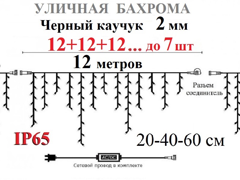 Светодиодная гирлянда 12 метровая "Бахрома" имеет изящный провод из черного каучука 2 мм и предназначена для праздничного освещения на улице.