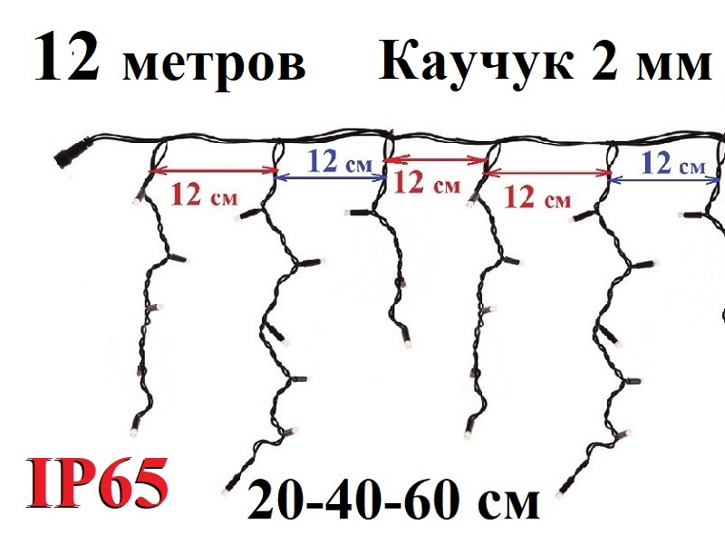 Длина гирлянды - 12 метров + 1 метр провод с контроллером и вилкой для сети 220 Вольт.