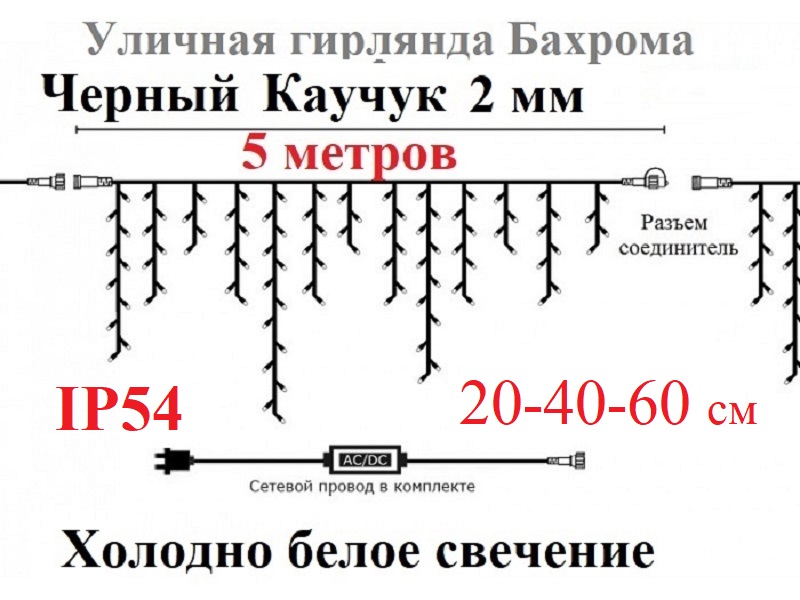 Вид - бахрома. Длина нитей сосулек - 20-40-60 см. Расстояние между сосульками - 12 см.