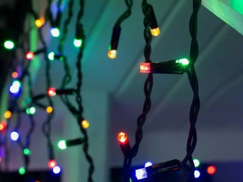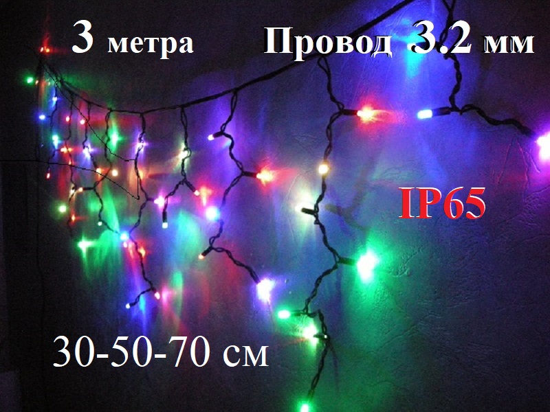 Уличная гирлянда бахрома Цветная 3 метра имеет морозостойкий черный провод 3,2 мм и белые светодиоды 8 мм предназначена для праздничного освещения дома, бани или гаража IP65.