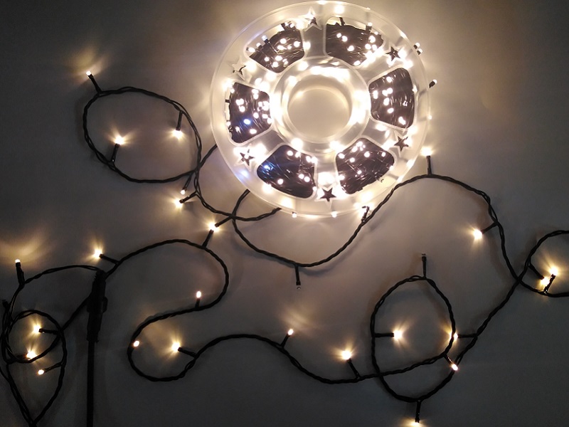 Желтая елочная гирлянда с белыми огнями создаст праздничное настроение на Новый год.