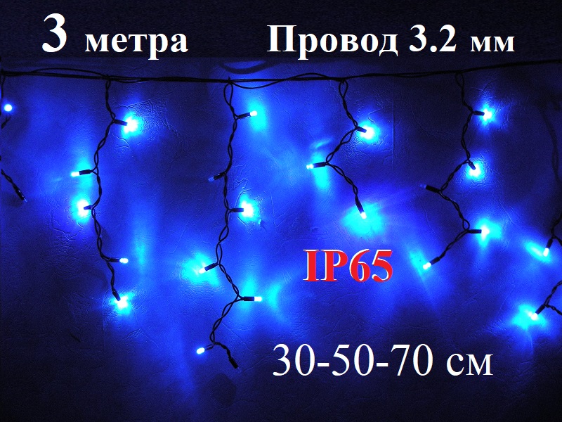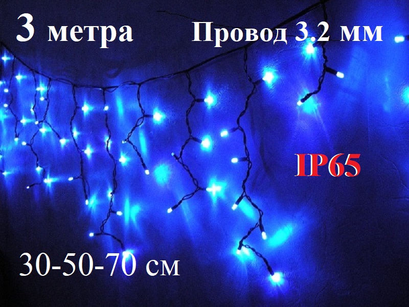 Уличная гирлянда Бахрома Синяя с белым мерцанием 3 метра 30-50-70 см имеет морозостойкий черный кабель ПВХ 3.2 мм и светодиоды 8 мм предназначена для праздничного освещения на улице.