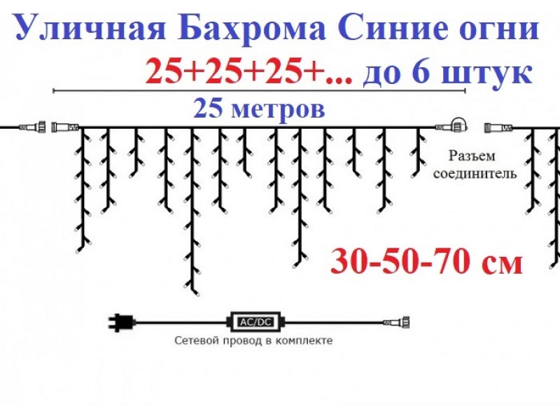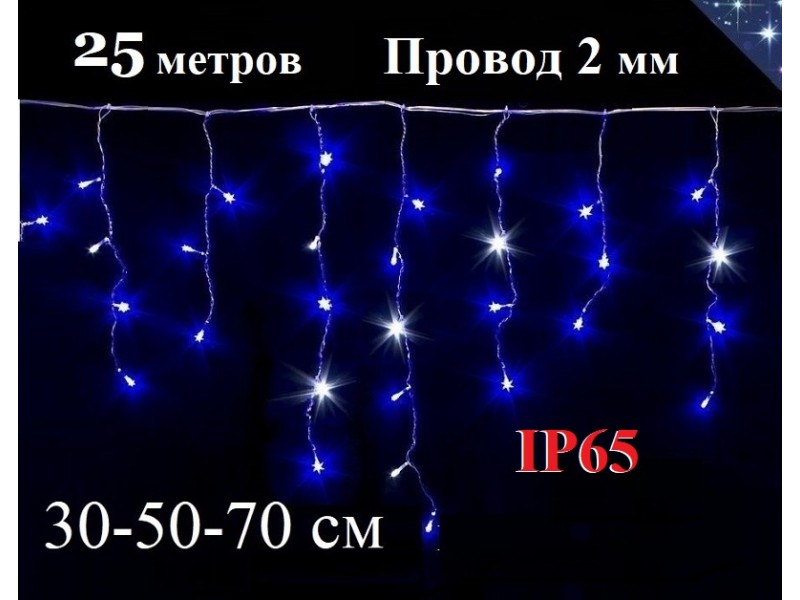 Светодиодная гирлянда Синяя Бахрома с одиночным мерцанием 25 метров имеет нити 30-50-70 см из белого провода 2 мм и предназначена для праздничного освещения на улице.