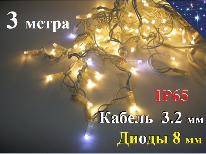 Уличная гирлянда Теплая белая Бахрома 3 метра 30-50-70 см имеет морозостойкий белый кабель ПВХ 3.2 мм и светодиоды 8 мм предназначена для праздничного освещения на улице.